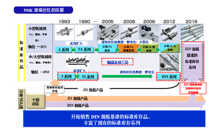 本次,NSK以欧州等地区广泛采用的DIN规格为基准,开发了新的标准库存系列滚珠丝杠并开始销售。