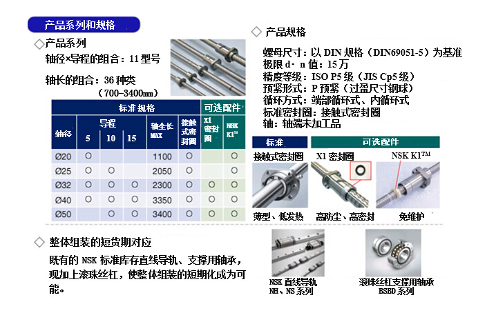 备有11个型号、36种类的滚珠丝杠规格(轴径Ø20~50mm、导程5~20mm、全长700~3400mm)。